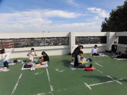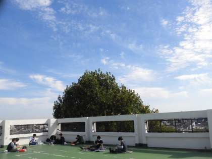 6年生の給食、屋上でお弁当を食べました。今日は連合運動会の予備日でもともとお弁当をもって来る日なのですが、子どもたちの屋上で食べたい、という希望があり、それは気持ちいいだろうということで、屋上でお弁当を食べてたというわけです。