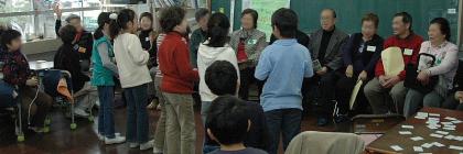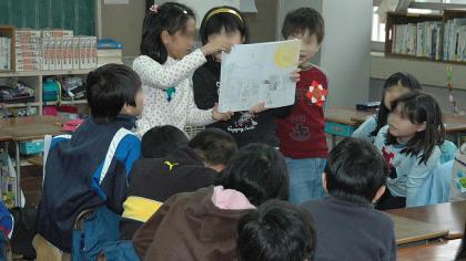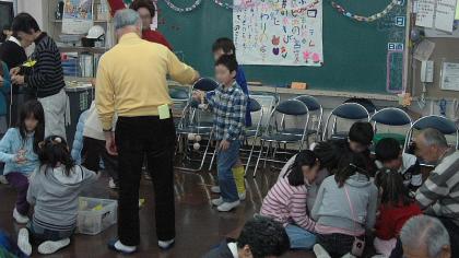 つづき〜 あいさつの後は、1・2・3組それぞれが趣向をこらしたすごし方を考えました。1組はお客様に学校に関係するクイズを出したり、グループごとに遊びにくわわっていただいたりしました。2組はグループが絵本の世も聞かせにチャレンジ。聞いていただきました。3組は主に昔の遊びを教えていただきながら楽しみました。 〜つづく