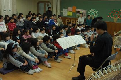 1月27日、三曲協会の方々による演奏会がランチルームで行われました。子どもたちは、音楽の授業で琴の弾き方を教わり、実際に自分たちで音を出しているので本物の演奏を真剣に聞いていました。(琴は、音楽の先生が近隣の学校から借りてきて16竿用意しています!)(5年担任)