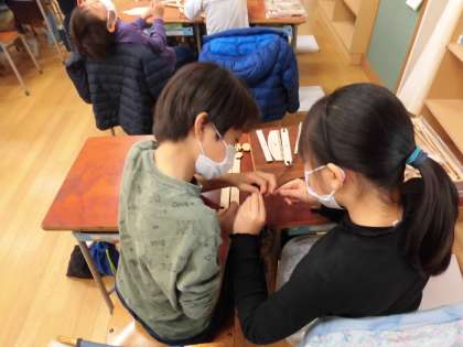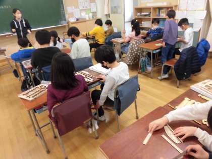 今日は、機織り機を自分たちで組み立てています。2人で1台の機織り機です。先生の説明を聞くのも、待ち遠しくて「先生、次は」といろいろなところから声が上がります。協力して作り上げると、早く機織りがしてみたくてたまりません。意欲いっぱいの子どもたちです。