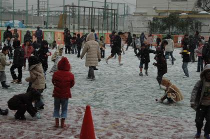 雪がつもった校庭。20分休み、校庭を遊びに開放しました。冷たい雪に負けず、子どもたちは大喜びで雪遊びをしました。終わったあとは大変でしたが・・・。