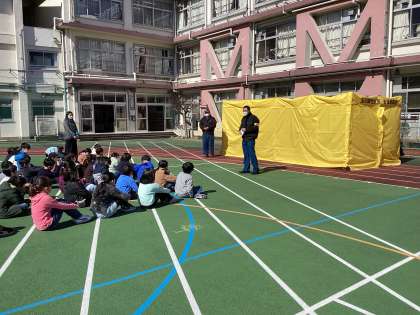3年生と6年生が煙ハウス体験を行いました。煙ハウスというのは、建物火災か起こったときどのように避難したらいいか、体験を通して学ぶことができるように建てたテントです。3年生の子どもから、あまり大きくないテントで、中を避難すればいいか分かっているのに、煙がなかにあるために、出口が遠くにあるように感じました、という感想が聞かれました。煙の怖さがよくわかったと思います。もし、火災にあったときは今日の体験を思い出して、避難してほしいと思います。