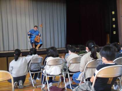土曜授業日です。2年生が体育館で演奏者の方をお招きして「馬頭琴」の演奏を聴く授業を行いました。、演奏を聴いたりしました。国語の時間に「スーホの白い馬」という物語を学習し、その発展として今日の授業が行われました。楽器を間近で見たり、力強く美しい楽器の音色を聴いたり、お話を聞いたりと子どもたちは楽しく学習しました。