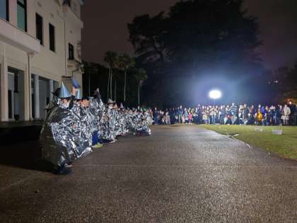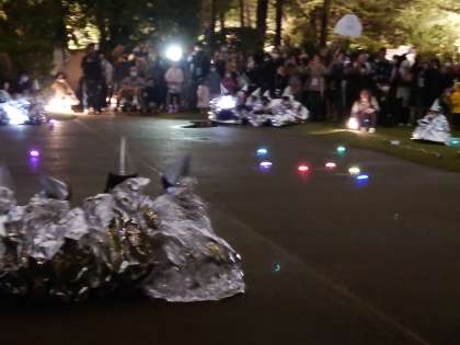 夜7時から庭園美術館で、3年生がプログラミングでボールロボットの披露をしました。2年生で、学校で行なったプロジェクションマッピングのときのものです。