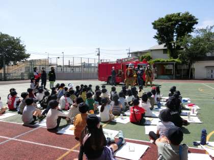 1,2年生の「はたらく消防写生会」がありました。玉川消防署から消防車両が2台、やってきました。赤いボディのこの車を見ただけで、子どもたちは大喜びです。さらに、消防署員の皆さんが、60秒以内で服を着替えて出動準備をするところや、装備をして動くところを見せてくださいました。