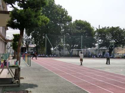 関東地方が梅雨入りしたということです。日中はよく晴れて体力テストを実施することができました。校庭ではボール投げが行われています。東門から校舎側に向かって、あまり広くない校庭を工夫して使って行われました。