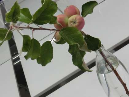 この前の大雨と大風のときに落ちたリンゴの枝が、八幡ファームに落ちていました。少し赤く色づいたリンゴが実っている枝です。これから雨の降る日が多くなると思いますが、身の回りをよく見ると、花や虫や果実などこの季節に特有のものを見つけることができますよ。探してみてください。