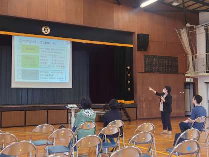 体育館で、保護者対象のネットリテラシー講座が行われました。参加の数は少なかったのですが、来てくださった方は熱心に講師の話を聞いてくださっていました。6年生向けの講座のときに一緒に聞いてくださった方もいます。