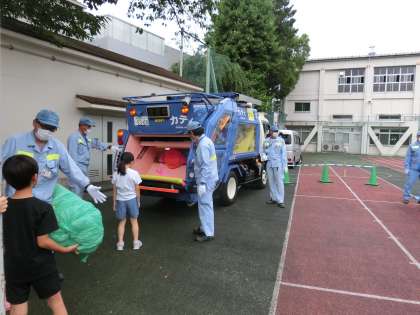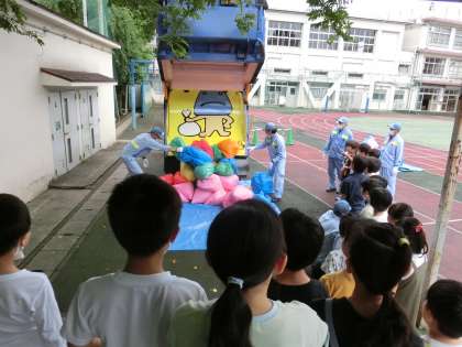 校庭では4年生がゴミについての学習をしています。体験学習用のゴミ収集車「カティ」を使って、ゲストティーチャーとしていらした方々が分かりやすく説明してくださいました。家庭から出るごみは、3kg、5kg、8kgがほとんどということで、実際にその重さの袋を持ってみました。子どもたちは軽々と持って見せていましたが、大人の私でも8kgはちょっと重かったです。これが毎日のように集められて処理されるのですから、その仕事にあたっている方々は相当大変だろうと思います。子どもたちも体験を通してそのことが分かったようです。ゴミの削減について、どうしたらよいか考えてみましょう。