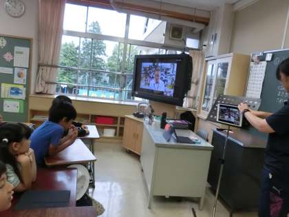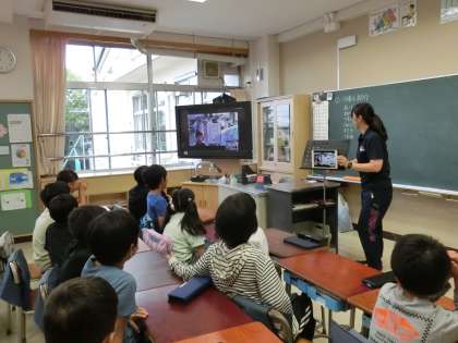 1組、2組のそれぞれの教室をつないで、学校紹介をしたり質問をしあったりしました。