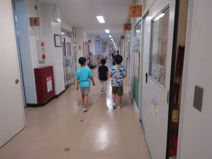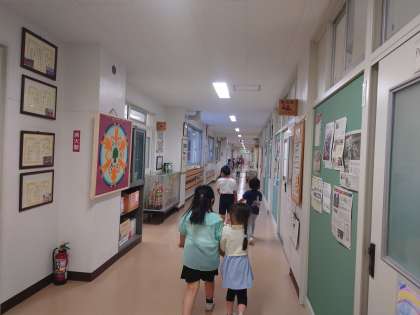 1年生と2年生が静かに1階の廊下を歩いていきます。校長室のドアが開いていると、そっと覗いて軽くおじぎをしていきます。生活科の時間、「廊下の歩き方検定?」という学校探検、2年生にとっては学校案内なのだそうです。休み時間、思わず廊下を走ってしまうことが多いので、廊下の歩き方を考えさせ、廊下は走らないということをいい習慣にしようという試みです。2年生が1年生を上手くリードして、本当に静かに歩いていく子どもたちでした。みんなこの検定に合格できましたね。