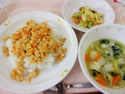 高野豆腐のそぼろ丼は、鶏ひき肉、たまねぎ、そしてたっぷりの高野豆腐を入れて作りました。