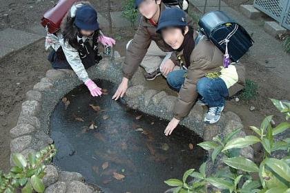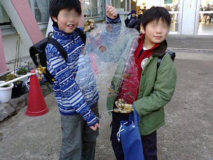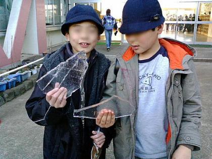 本校の北西角、通用門のところに小さな池があるのですが、今日は全面結氷し、厚さ1cmに近いような氷がはりました。登校してきた子どもたちに、そのことを伝えたところ、大喜び。写真はその時の様子です。手にもっているのが池からとりだした氷です。