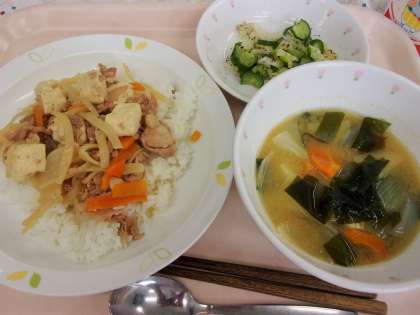 豚すき丼は、豚肉、しらたき、豆腐などをすき焼き風の調味料で煮て、ごはんにかけました。甘辛い煮汁とごはんがよく合います。廊下を歩いていると、名前だけでおいしそう!って声が聞こえてきました。いつもたくさん食べてくださって嬉しいです!