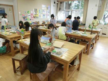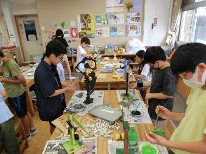 土曜授業日です。5年生の図工の授業では「糸のこドライブの木」という題材に取り組んでいます。初めて電動糸のこを使う5年生ですが、慣れたもので上手に板を切っていきます。思いのままに曲線切りを楽しむ学習だということです。しかも、切っているものなかには、版画板もありました。これは4年生のときに行った版画の板で、それを保管しておいて、再利用しているのです。曲線切りできたものを組み合わせて、色を付けると「糸のこドライブの木」が完成します。みんな集中して取り組んでいました。