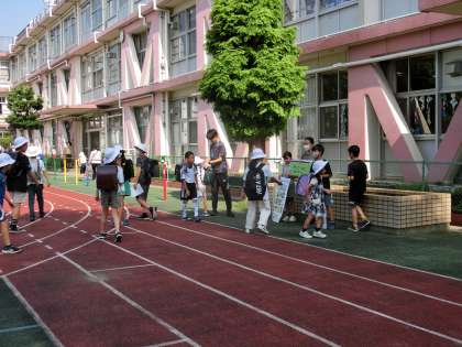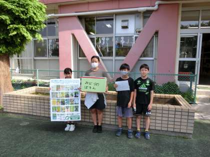登校してくる子どもたちの額にも汗が見えるくらい、暑い一日でした。代表委員会の子どもたちが2か所で募金活動を行っています。緑の募金です。「協力をお願いします」と呼びかけています。募金専用の手作り封筒にお金を入れてきた子どもたちが、募金箱に次々と入れていきます。