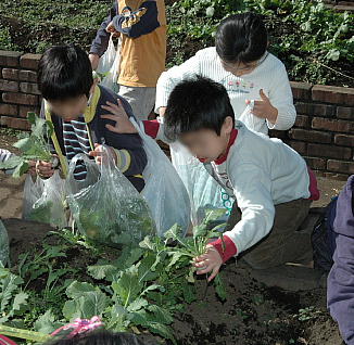 25日4校時、1年生が本校の学級園でカブの収穫をしました。栽培活動でいつもお世話になっているWさんに指導していただき、秋に植えた種から、見事に育ったカブを歓声をあげながらぬきとりました。子どもたちは本当にうれしそうでした。先日の雪や今日の冷え込みにも負けず、葉も青々として立派なものでした。1年生の各家庭で、おかずにカブを使った一品をお願いします。農薬は使っていませんから、葉も味噌汁にどうぞ。