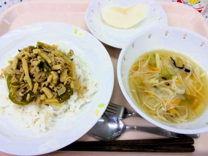 チンジャオロースは、ピーマンと細切りにした肉などを炒めた中華料理です。給食では、食材費や栄養価の面で、今日は細切りの高野豆腐が入っています。高野豆腐は、たんぱく質や鉄、食物繊維などが豊富に含まれている食材です。調味料も、うま味とともに吸ってくれ美味しく仕上がりました。