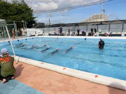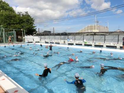 今年最後のプールを利用した授業です。6年生の「着衣泳」で、ゲストティチャーに日本赤十字社から水上安全法指導員の方を3人お招きしました。不意に水の中に落ちた時、どのようにして命を守るのか、という内容で実際に、衣服を着たまま浮かんだり、泳いだりしました。もしも、水難事故にあったら、助けがくるまで浮かんでいるようにすることが大事なのだそうです。子どもたちは、水に衣服が浸かると重くて溺れそうになること、ペットボトルを使って浮くことができるということなどを、体験を通して学んだようです。