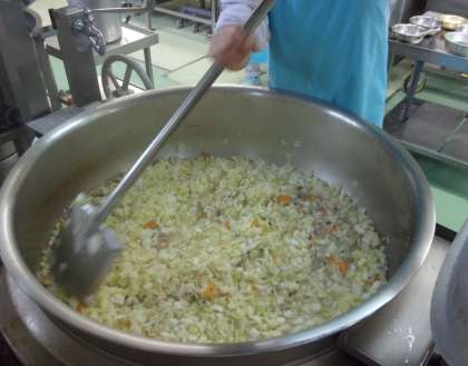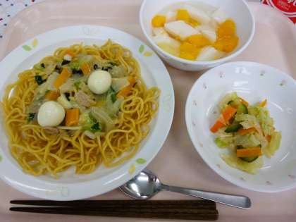 給食では、麺をフライパンで炒めうように作るのは難しいため、今日はオーブンで蒸し焼きにしています。