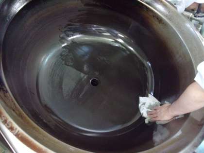 ※3枚目の写真は、回転釜の手入れをしているところです。洗浄したあと、油をなじませています。