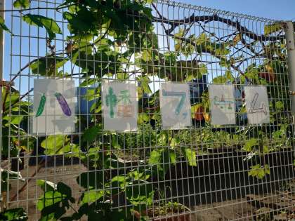 季節の変化は八幡ファームでも感じられそうです。いろいろな果実が実っています。写真は昨日のものですが、看板を委員会の子どもたちが新しく作ってくれました。大事にしたい学校の畑です。