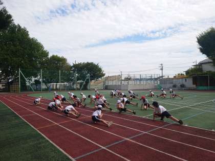 秋空の下、6年生の体育の授業です。整列したり準備運動をしたり、子どもたちが進めていきます。今月末に連合運動会があるので、3つの種目に分かれて練習に取り組んでいます。