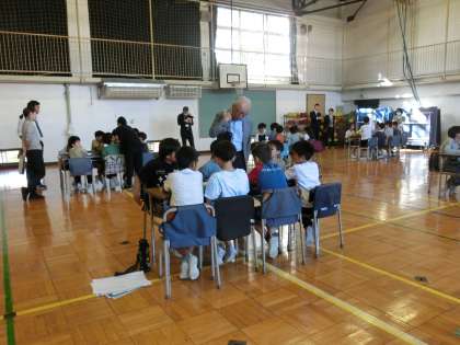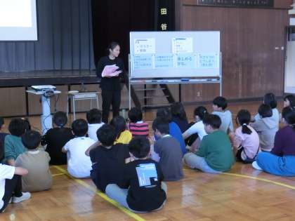 さわやかな秋の空が広がりました。5時間目、4年生が学年全体で総合的な学習の時間の授業を行いました。