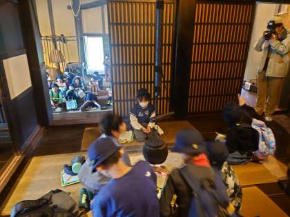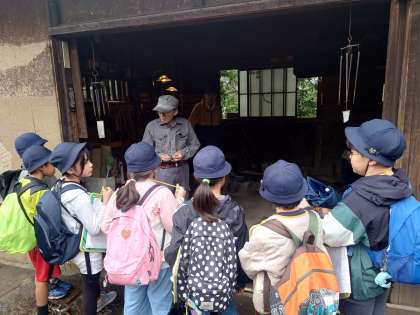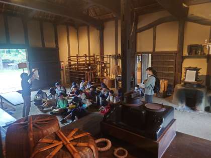 民家園で昔の暮らしについて、話を聞いたり、物を見たりしています。グループの行動では、他の方たちのことをきに留めながら、静に話を聞いたり、さわやかな挨拶をしたり。他の方からほめられる場面もありました。