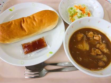 今日は、米粉入りパンです。普段給食で提供しているパンは小麦粉を使ったパンですが、今日のパンは、材料の一部に米粉を使用しています。米粉は、お米を細かく砕くことによってできる粉の事です。米粉パンは、小麦から作られたパンと比べると、水分含量が多く、腹持ちがいいとされています。また、もっちりとした食感は噛む回数が増えるため、満足感を得られるという効果も期待できるそうです。
