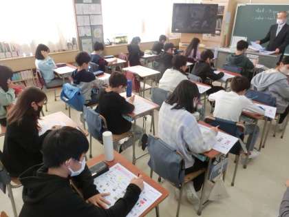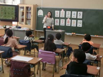 1年生の教室では数字を調子よく、英語で言うことに慣れようとしています。1から10までの数字のなかから好きな数字9つを選んでビンゴゲームの準備して、誰かに好きな数字を言ってもらって同じ数字だったら〇をつけ、3つ並びができると「ビンゴ」です。楽しく英語を学んでいました。。