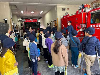 3年生が玉川消防署奥沢消防出張所に行きました。消防士さんにいろいろなお話をしていただきました。特別に施設内の様々なところを見せていただきました。実際に見学し、救急車か不足している話や消防服を40秒で着るという話を聞いて、さらに考えを深めた子どもたちです。奥沢消防出張所の皆さん、お忙しい中、とても丁寧に案内していただきありがとうございました。