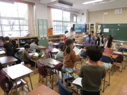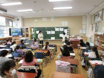 2年生の算数の授業です。かけ算を使って、問題を解こうとしている場面でした。みんなでこの時間の学習のめあてを作って、子どもたちは意欲満々です。図を使って、できるだけ早くわかりやすく解くように考えています。そのあと、友達と考えたことを披露しあって確認します。こういう学習の流れが定着していて、子どもたちがいろいろ考えを深めながら、算数に取り組んでいました。楽しい算数の時間でした。