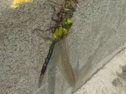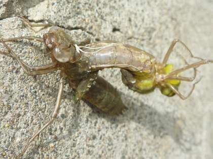 しばらくたち、行ってみると立派に羽化していました。まだ羽が濡れているので飛ぶことはできませんでしたが、しっかりコンクリートにしがみついていました。