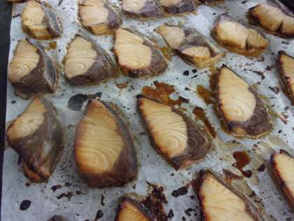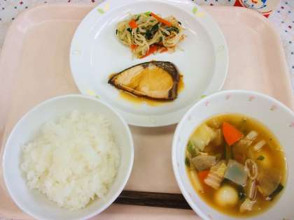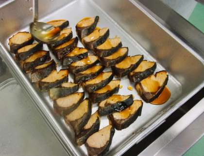 ぶりは、脂がのった新鮮なぶりです。酒、しょうゆ、さとう、みりんで下味をつけオーブンで焼きます。焼きあがったら、下味と同じ材料の調味料を加熱したれを作りかけて完成です。(給食ではたれをかけながら焼くことができないので、仕上げにかけています。)ぶりのうま味と甘辛いたれで、ごはんがすすんだのではないでしょうか。