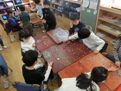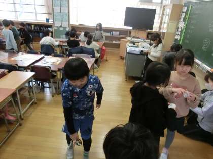 校舎内を回ってみたら、ある教室で「昔の遊び」を行っていました。この前は双六をやっていた子どもたちですが、今日は、コマ、お手玉、おはじきなど、夢中になって遊んでいました。コマを上手に回す子に「むずかしいでしょ」と聞いてみたら「幼稚園のころはよくやっていたけど、最近はあまりやっていなかったです。ぼくにとってはあまりむずかしいことではないけれど、初めての子にはどうかな」と答えが返ってきました。