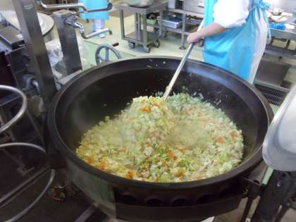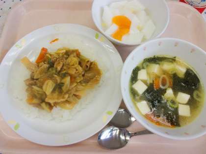回鍋肉は、キャベツなどの野菜と豚肉を炒め、テンメンジャンをベースとした調味料で甘辛く味付けをしました。給食では大量の野菜を炒めると水分がたくさんでるため、味付けをした後でん粉でとじます。そのため、料理としては炒め物ですが、うま煮のような食感です。給食でシャキッとした炒めものはなかなか難しいですが、少しずつ改良できたらなと思います。
