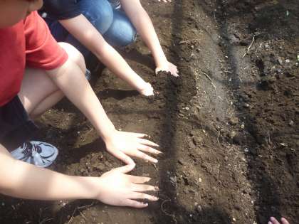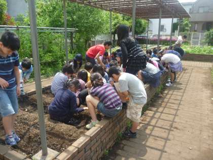 今日は4年生が学校園に植え付けをしました。ヒョウタン、ヘチマ、枝豆、ヒマワリ、マリーゴールド、百日草の種をみんなで協力して植えました。