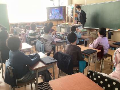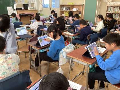 ICT支援員の先生から、10年後の未来、日本はどんな世界になっているかという動画を見せていただきました。子どもたちはAIと人がうまく付き合っているであろう未来について目をキラキラさせて驚きながら動画を見ていました。その後、ハングリーバードというサイトでプログラミングの学習をしました。画面上の鳥に対して間違えず指示をするために、自分の体を小さく動かしながらよく考えてプログラムを作っていました。