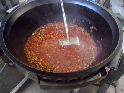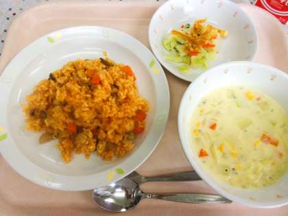 チキンライスは、お米と一緒にトマトジュース、塩、パプリカパウダーを入れて炊飯します。ごはんが炊き上がったところに、鶏肉、玉ねぎ、にんじんをケチャップを炒めて作った具を混ぜます。チキンライスといえば、ごはんと具を炒めケチャップで味付けをするのが定番ですが、給食ではごはんと具を一緒に炒めるのは難しいので、ごはんと具を混ぜ合わせています。ごはんを具と混ぜる際に、味のむらが出ないようにするため丁寧にほぐしながら混ぜるのが腕の見せ所です。