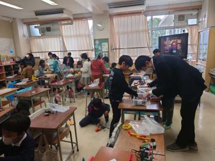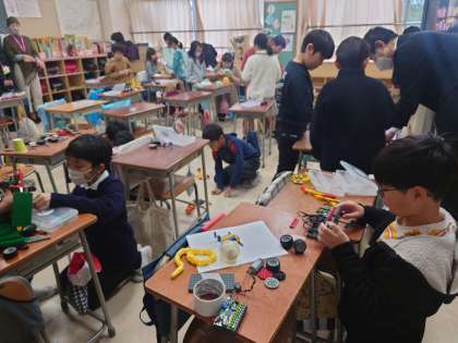 4年生のプログラミング学習で、子どもたちが思い思いに動くおもちゃを作っています。オンラインでゲストティーチャーとつながり、ICT支援員の方に教えていただきながら、どんどん作っていきます。ゲストティーチャーの先生は、大学の先生の部屋から子どもたちの活動の様子を見て、とても感心していました。