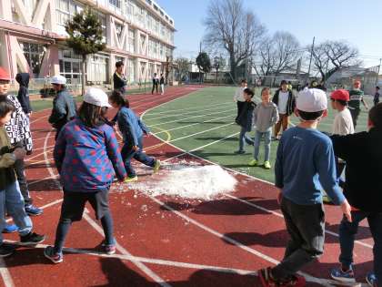 昨日、校庭で作った雪の作品(?)が、どんどん小さくなっていきました。それでも、子どもたちは雪とのふれあいを求めて、校庭に飛び出してきました。氷のように固くなった雪を見せに来てくれた子もいます。