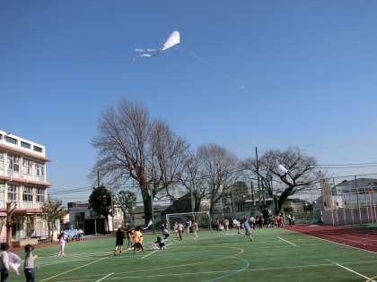 雪がとけたあとの校庭で、1年生が生活科の時間、凧揚げを楽しんでいました。