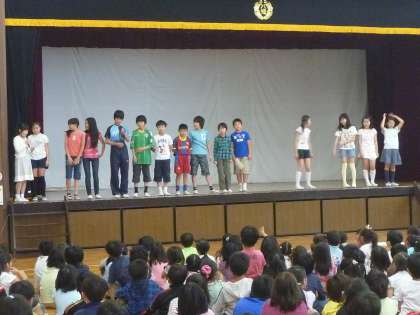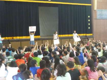 今朝は集会委員会が楽しいクイズをみんなに出してくれました。「飛んでいった物は何だ?」という内容です。体育館の緞帳の間を飛んでいったものが何か、三択で選ぶ問題です。子どもたちは瞬時に横切った物を認識し、正確に解答していました。