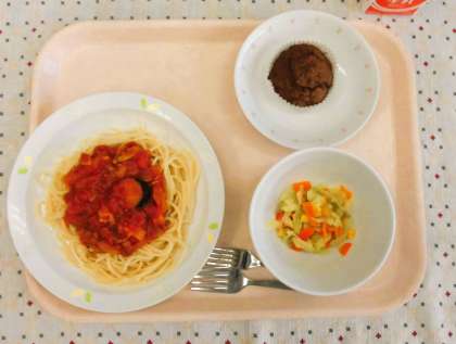 トマトソーススパゲッティは、オリーブオイルでにんにくを炒め香りを出し、ベーコン、玉ねぎを炒め、たっぷりのホールトマトを使ってソースを作りました。なすは素揚げし、出来上がり直前に加えて完成です。水分は入れず、トマトのうま味たっぷりのソースに仕上がりました。給食終わりに、トマトソースの感想を子どもたちに聞くと、美味しかった!なすが少し苦手だけど美味しかったです!など、たくさん声を聞くことができました。