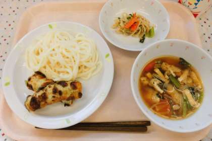今日は、油揚げたっぷりのきつねうどんです。こんぶ、かつおぶし、さばぶしを合わせて、だしを丁寧にとりました。だしがしっかりしているので、風味、うま味が抜群のうどんの汁に仕上がっています。