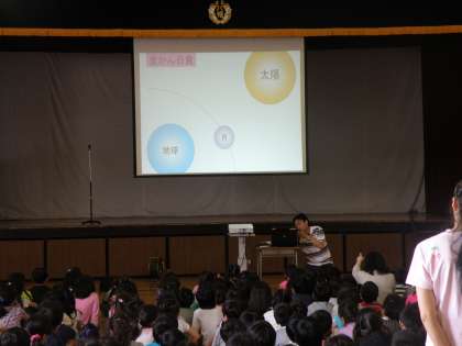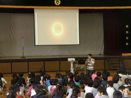 全校朝会で、金環日食について説明