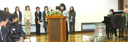 後半は、6年生一人一人の幼い頃の写真の披露があり、プロジェクターで大スクリーンに映し出される姿に、会場がわいていました。本当にみんな大人になったものです。最後に担任への花束贈呈とお礼の一言があり終了しました。当日は肌寒く途中から大雨が降ってくるなど、コンディションはあまりよくなかったのですが、担当の皆さんのご努力によって華やかに装飾された会場と、前もってストーブで暖めてあった会場のおかげで、楽しいひと時となりました。ありがとうございました。