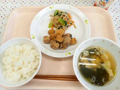 今日は、かつおと高野豆腐にそれぞれ下味をつけから揚げにしました。煮物などに使う高野豆腐ですが、下味と衣をつけて揚げると、不思議とから揚げの味がして食べやすく仕上がっています。