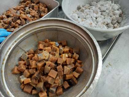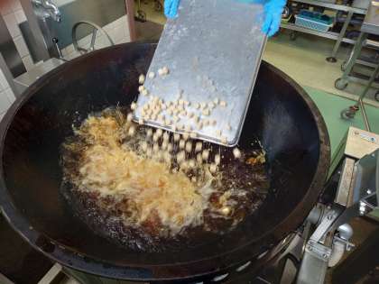 ※写真3枚目は、粉付けしたかつおを揚げ釜に投入しているところです。